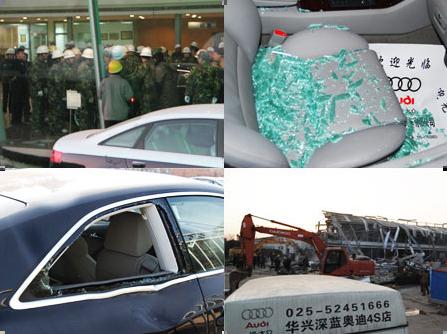 在隨后的7個(gè)多小時(shí)中,這些人砸碎玻璃,用事先準(zhǔn)備好的乙炔槍切斷奧迪店的外鋼支架,又在店中又砸又搶。當(dāng)時(shí)店中有40多名值班的員工,有的被直接打出、趕出店外,有的則嚇得躲進(jìn)展廳內(nèi)的展車。