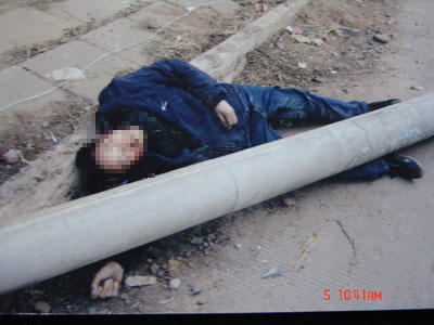 5日下午4時,汝州當(dāng)?shù)貧鉁氐陀诹阆?度。中國網(wǎng)通汝州分公司門外被駐足的市民團團圍住。一名自稱姓任(音),是網(wǎng)通公司警務(wù)室工作人員的中年男子叉腰站在門口臺階上。他的身后,死者魯偉政8歲的兒子魯志恒和剛滿一歲的妹妹依偎在媽媽懷里,驚恐而無助的望著他。一番爭論后,任姓男子緩緩點燃一根香煙,指著身后席地而坐的家屬大聲叫道:“你們這樣做是違法的!”“再吵把你們?nèi)テ饋!”任姓男子的說法立即引起圍觀群眾的強烈不滿,現(xiàn)場的爭吵聲將原本躺在媽媽懷中熟睡的女嬰嚇得大哭起來。