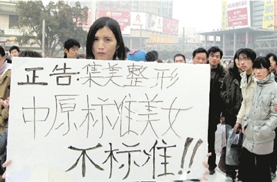 “人為地給美女定下標準,是對中原女性的不尊重。”昨日下午,二七塔下,一名身材高挑、披肩長發、顴骨高凸、細看還有喉結貌似女人的男子舉著一塊牌子,牌子上寫著:正告集美整形,中原標準美女不標準!這名男子不時用雙手將牌子舉過頭頂,引得周圍的人們指指點點。