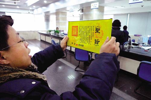“奉天承運,皇帝詔曰……張磊要對她比自己還要好……”昨天上午,在杭州體育場路某銀行,這一電視劇里的場景成了現(xiàn)實:小伙子張磊大約清宮戲看多了,手持“圣旨”,滿腔熱情地宣讀了自己對女孩小如(化名)的愛意。