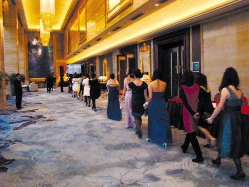 也許佳麗們太緊張了,車到酒店門口時,一大群西裝革履、胸佩飾花的男子迎在門口,嚇得有些人不敢下車。后來才弄清楚,這群人原來是來開婚宴的。隨后,盛裝靚女們被送到一休息室進行最后換裝。