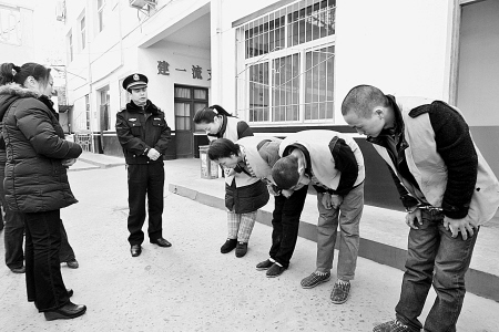 4個騙子昨日站在辛家廟派出所的院子里,面對受害人大梅悲憤的責問,一起給大梅深深地鞠躬表示道歉。