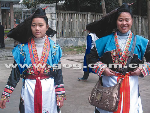 記者看見,穿戴盛裝的男子們均身穿青藍色的長衫,外加一件白色的小褂。據稱,這件小褂名為旗幟褂,上面還繡有夜郎王印,穿戴旗幟褂,這與祖先們打仗有關,他們頭上戴的用黑布包裹的帽子有五個角,看上去讓人頓生威嚴之感(如圖);而夜郎美女們穿戴的是一套漂亮的有各種色調的衣裙,據她們說,這叫七江裙,上面記錄有他們的祖先約3000多年前遷徙的歷史。而最令人注目的,還是這些夜郎美女們的發(fā)型。只見她們的頭上均插了一根約兩尺長的竹片,長長的頭發(fā)繞著竹片使頭發(fā)在右側成了一個半弧形(如圖)。她們告訴記者,這種發(fā)型也是竹王崇拜的一種。
