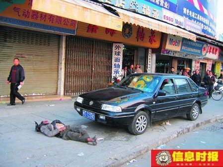 據停在路口待客的一些“摩的”司機透露,這名男子在此流浪已有五六年時間了,他平日里也不向人乞討,就靠好心人接濟為生,晚上就睡在路邊店鋪門前。當時那輛小轎車停在人行道上,車主先是下車去買東西。過了不久,那名流浪漢走到離車頭前幾步遠的地方躺在地上,閉起眼睛曬起“日光浴”,似乎已經睡著了。后來轎車司機回來開車,卻沒有注意到車前竟躺著一個人,無情的車輪軋過流浪漢的頭部,他一聲都沒發出就送了性命。幾個過路人合力將車頭抬起來,發現他已經沒氣了。
