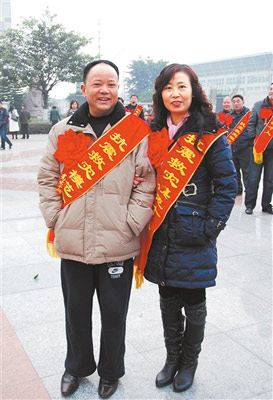 在什邡市政府研究室副主任廖曉軍的相機里,有一張劉慶祿夫妻披著抗震救災模范綬帶的照片。廖曉軍說,去年12月30日,市委、市政府召開抗震救災表彰大會,辦公室通知劉慶祿參會時,他說自己正在值班,要去幾個受災鎮發放過冬物資,就不參加了。因為他作為模范個人代表不能缺席,于是就一再通知他務必到會。最后,他來不及回家換件衣服,就直接從倉庫趕到大會現場。也在這里,留下了生前最后的影像,也是和妻子的最后合影。