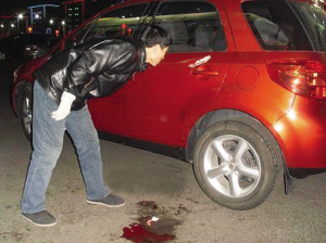 在一知情者的帶領(lǐng)下,記者找到了死者事發(fā)時乘坐的轎車。這是一輛紅色長安鈴木轎車,車的左側(cè)后座門把手上方,一個長約10厘米的大口子清晰可見,大口子已透過轎車鋼板,足見當(dāng)時進入車內(nèi)煙花的威力之大。轎車后座的靠背上,還留有一大攤血跡。