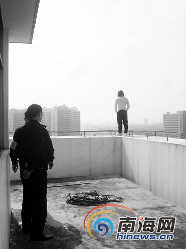 15日下午2點多鐘,16歲女孩阿春(化名)來到海口龍昆南路“麗波皇宮”所在酒店的樓頂要跳樓自殺,海口民警、消防人員及120急救醫生緊急趕往現場救援。一個多小時后,消防人員和民警才把阿春從樓頂邊緣救下來。