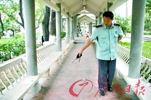 昨天中午,記者來到虎門執信公園找到該公園的保安隊長劉建洪。據劉建洪介紹,事發當天晚上10時左右,正在執勤的保安朱澤兵,突然看見公園的樓亭上圍有許多人。他立即跑前去,看見一名年輕女子滿臉都是血,尤其是其左臉有一處很長很深的傷口。當時該女子滿臉是血,正用手機給她的工友打電話:“快來救我,快來救我,我快死了……”說完話,那女子便暈倒了。朱澤兵當即用手機撥打110報警電話及120急救電話。他還叫來了多名在公園練習舞蹈的學生,一起抬起暈倒的女子跑向虎門醫院。