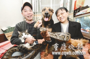 王啟懷老兩口沒有和孩子們住在一起。據了解,除了緬甸蟒外,老兩口還養了鷹、猴、八哥甚至青蛙等寵物,雖然寵物們每個月的直接伙食費都在300元以上,但他們卻其樂無窮,“你對它好,它就對你好。你沒有理由不善待它們。”(本欄稿件由 首席記者 黃艷春 實習生 楊雪婷 采寫)