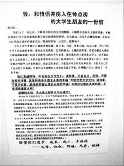原公開(kāi)信就貼在南京仙林大學(xué)城文苑路某高檔小區(qū)門(mén)口,信中告誡大學(xué)生不要“為了一時(shí)之歡,不顧養(yǎng)你們的親人的期盼,不顧給社會(huì)人才的榜樣形象,不顧給我們?nèi)粘I畹挠绊懀诰用裥^(qū)內(nèi)成雙成對(duì)地進(jìn)出……”公開(kāi)信還提醒提供日租房的小區(qū)業(yè)主“不要為蠅頭小利替他們愚蠢的沖動(dòng)提供溫床了!”信件的落款是“盼望你們進(jìn)步、成長(zhǎng)、成才、幸福的父母、叔叔、阿姨、兄弟、姐妹。”