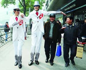 提起這兩個小伙子,南京市民可能并不陌生。2米26的那個叫張夢永,2米12的叫秦為超,快報曾經(jīng)報道過他倆的“雙塔組合”。昨天下午兩點,兩“巨人”出現(xiàn)在山西路上,穿著定制的白色禮服,戴著高高的白色禮帽,再配上酷酷的墨鏡,所經(jīng)之處立刻被圍得水泄不通。“哇,你有姚明高么?”“你們的腿是真的假的啊?”“這么大腳,是真的么?”圍觀的市民們提出千奇百怪的問題,兩個小伙子耐心地一一解答。