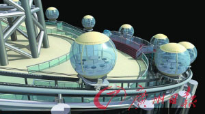 每個觀光球艙直徑3.2米,可“裝”4~6名乘客;球艙殼體采用新型高分子材料,晶瑩剔透,能保證艙內游客對塔外景色一覽無余。