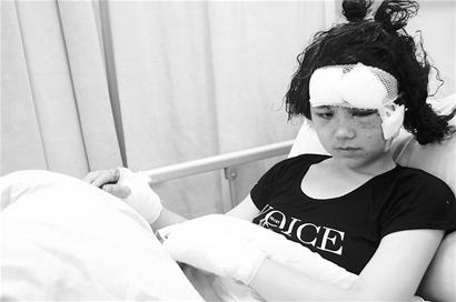 昨日上午9點半,在華西醫院急診科,馮曉蘭的兩名女同學正為她打理頭發。被鮮血浸透,頭發凝結成了一塊,根本無法梳理。經過幾天的治療,馮曉蘭的傷勢已明顯好轉,但紅腫的雙眼及面部的瘀痕依然清晰可見,緊裹紗布的雙手至今還不能動彈。她說,由于身體還處在恢復期,這些天來,起居都是由同學輪流照顧。