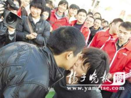 當天下午,一商家為了推銷新開發的果汁飲品產品,在宿遷市區舉辦一場“KISS我最牛”的接吻大賽活動。大賽規定,參賽雙方接吻時必須雙手背在身后,單腿站立,嘴唇吻在一起,誰的時間長誰就是冠軍。獲得冠軍的將當場獲得2009元現金,亞軍將獲得1001元現金,季軍也有520元的獎金。