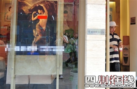 這家攝影店位于春熙路南口,在臨著步行街的一排商鋪中。店門口一扇巨大的落地玻璃櫥窗里,掛著兩幅照片,其中一幅就是侯女士提到的那幅裸照。照片大約有80厘米高、60厘米寬,照片上的長(zhǎng)發(fā)女子上半身正面全裸,下半身也只有一層薄紗遮蓋。路過(guò)的路人中,有不少人的目光都會(huì)在這幅照片上停留。