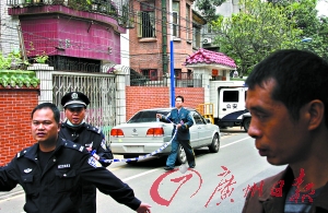 昨日中午,記者趕到現(xiàn)場,高為5層的33號大門緊閉,院內(nèi)站滿民警,門前排了11輛警車。記者觀察發(fā)現(xiàn),距離33號不到100米就是廣州最為繁華的地帶之一——五羊新城內(nèi)的達(dá)道路,路上車輛穿梭往來,周邊分布著廣州各大單位。距離33號大院的路對面,成排的老別墅被重新裝修一新,里面駐扎著數(shù)間公司,營業(yè)范圍有廣告、律師等行業(yè),白天人流不少。
