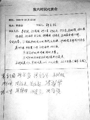 一份村民代表會議記錄上的簽名,代表說是簽到證明,鎮領導說是表決簽名