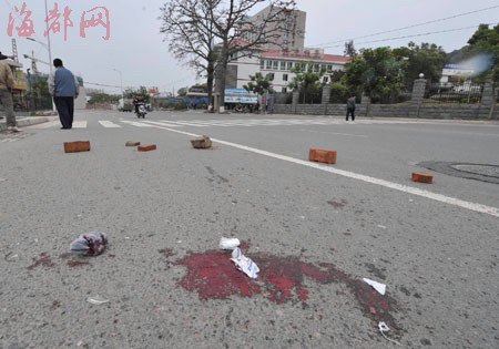 記者趕到現(xiàn)場時,老人剛被送往醫(yī)院,路面上滿是血跡。警方正在用磚頭圍著的事故現(xiàn)場勘查。“當時那名老人從分院走出來,過斑馬線時,一輛摩托車從他后面撞了上去。”一目擊者說,那輛“黑色,很新”的摩托車速度很快,“老人被撞得飛起,在地上滾了幾下,躺在路上呻吟著,頭上、腳上都是血。”