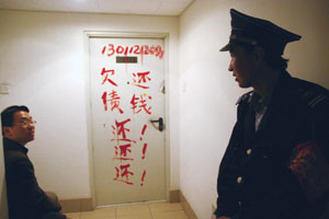 4月3日中午,東三環華騰園9號樓17層的居民張女士走出家門后,迎面看到鄰居門上的幾個紅色大字:“欠債還錢 還!還!還!”