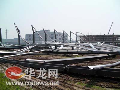 記者在現場看到,鋼架大約高10米左右,整個房屋鋼架已經全部垮塌,鋼架橫七豎八地散落在工地上,工地上的一輛工程車被落下的鋼架翻了個底朝天。據現場一位工人介紹,14日上午10時40分左右,他正在對面的在建廠房上做木工,突然聽到“轟”的一聲,“當時我就只看到廠房的鋼架全部垮了下來,幸好當時沒有好多人在房子上施工喲!”該工人告訴記者,當時只有2名工人正在鋼架屋頂上施工,鋼架垮塌后,該2名工人受傷,后被及時送往了醫院。