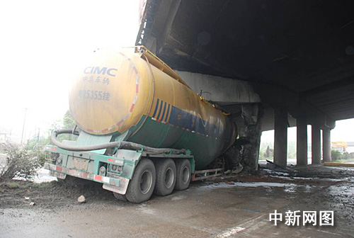 據現場勘察得知,發生事故的車輛號牌為粵R5355,是一輛罐體車,屬廣東一家物流公司車輛,車輛在郴資桂高等級公路由資興往郴州方向行駛時,撞上郴資桂高等級公路與京珠高速公路立交橋,將立交橋第一根橋墩撞斷為兩截,并將第二根橋墩撞擊移位,高速公路塌陷的橫梁壓在半掛車罐體上,造成2人當場死亡,1人受傷。事故導致京珠高速公路主干道南往北方向橋面塌陷,交通中斷;北往南方向路面有錯位。