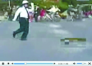 視頻于3天前出現(xiàn)在優(yōu)酷網(wǎng)上。打開視頻,戴白頭盔、穿藍制服的男子在繁忙的路口指揮交通。