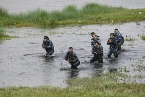 4月9日上午10時許,從湛江某地一處僻靜的港灣里,突然傳出一陣陣震天的吼聲———“絕對服從”!只見15名身穿藍色迷彩服,身背制式長槍,臉上涂著迷彩,裹著黑色頭巾的年輕人,每5人一組,合力扛著3根各約400斤重的圓木,在港灣邊上的泥濘里跋涉。