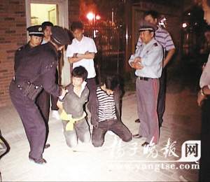 記者趕到現場時,兩名年輕男子雙手被反綁,跪在小區門口不敢動彈,他們的臉上有多處傷痕。兩名男子四周站滿了小區業主,面對大家的指責,他們低下了頭,不斷求饒,讓大家放他們一馬。據一名小區保安介紹,當晚,他和另外一名保安在門衛室值勤。到了9點半時,他發現兩名陌生男子推著一輛自行車從小區內走來,兩人還邊走邊四處張望。他覺得對方可疑,當即喊上一名同事上去盤問。經盤問,兩名男子并不是小區業主,也無法說出來小區的目的,對于自行車的來歷,更是支支吾吾。細心的保安發現自行車鎖有明顯被撬痕跡,當即斷定兩人是偷車賊,于是,當場將這兩人按倒,同時呼叫其他保安增援。小區業主孫先生說,兩名偷車男子被揪住后不一會兒,就哭著求饒了,并主動承認他們是來小區偷自行車的,也表示將自行車歸還,希望保安放他們一馬。兩保安見那兩男子服軟了,才停手,但他們沒有立即報警,而是找來繩子將兩名男子雙手反綁在背后,然后脫去他們的鞋子,逼迫他們跪在門衛室門口。