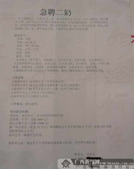 記者在網上找到了這張啟事的圖片,上面介紹說,招聘二奶的主角是浙江溫州一家服裝公司的CEO,姓劉,招聘的目的是為了滿足“工作出差、生活上的需要!
