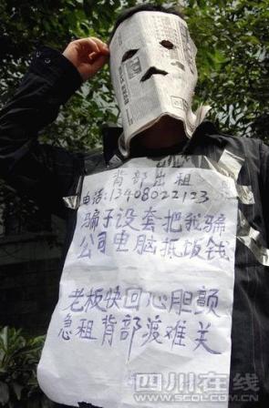 一男子昨日在成都街頭以100元每天的價(jià)格出租背部,號(hào)稱“資深策劃人”的王江同時(shí)出現(xiàn),但他否認(rèn)是其杰作