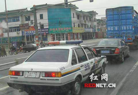 帖中共有四幅圖片,從不同距離不同角度拍攝了這輛行駛在馬路上的警車,車身上印著方方正正的兩個藍色大字“法院”,而車的前門卻赫然貼著一個倒著的警徽,無比顯眼。帖中還介紹說,這組照片拍攝于5月14日的常金公路上,警車車牌為:蘇DA078警。