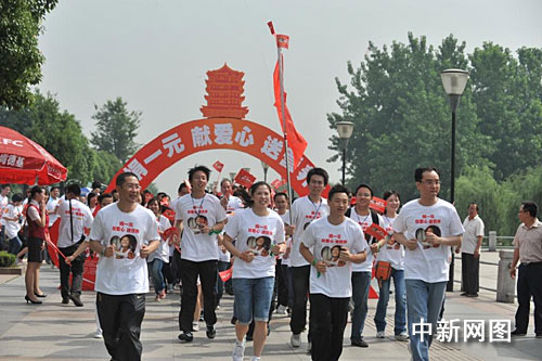 當日,湖北籍奧運冠軍楊威、高崚的帶領下,近300名武漢市民組成“漢口”、“漢陽”、“武昌”三個愛心方陣,手持“捐一元,獻愛心送營養”的小紅旗,身著統一的獻愛心T恤,沿著漢口江灘跑步前進,沿途不斷地向周邊行人和游客發放愛心貼紙,呼吁更多的武漢市民參與到該項活動中來。