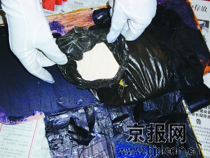 民警拿過嫌疑人手中的藍(lán)色手提包進(jìn)行檢查,發(fā)現(xiàn)提包底部的夾層鼓鼓囊囊,打開一看,原來是層層包裹的白色海洛因,重約0.7公斤。經(jīng)初步審查,前來接頭的男子姓羅。偵查員根據(jù)掌握的情況,迅速趕往海淀某小區(qū),對男子阿某在北京的暫住地進(jìn)行搜查,成功起獲了數(shù)個(gè)塑料袋包裝的1.1公斤海洛因毒品。