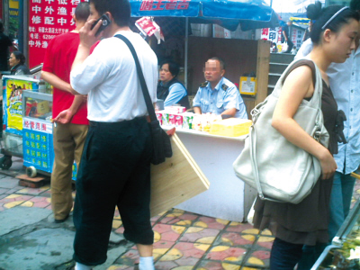 6月13日,網友“透明”在大渝網發帖稱,當日他前往楊家坪辦事,看到一個光頭城管正在幫一個小販看攤,詫異之余用手機拍下了這一幕。記者從照片中看到,在人行道上,一個由一把太陽傘和一個玻璃柜臺組成的雜貨攤后面,該城管正悠閑地坐著,似乎很享受守攤的感覺。