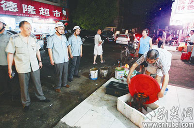 8時許,記者隨洪山區執法隊來到圖書城路,遠遠便看到幾處燒烤攤上空煙霧繚繞、氣味嗆鼻,一家油燜大蝦店外,五六張餐桌橫亙在人行道上,桌上蝦殼堆成小山,桌下污水橫流。“老板,你這樣出店占道經營違反了市容管理規定,請你配合一下,把桌子收到店里去吧。”“進去哪有生意做?”勸說、宣傳無效,50名執法隊員圍站成一圈,雙手背在身后,沉默地注視著食客和坐在一旁的老板。如此“對峙”了27分鐘后,兩桌食客先“頂”不住了,草草結賬離去,老板與另兩桌食客又“堅持”了片刻,最終悻悻地收拾起桌椅搬進了店內。