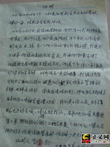 但事情到后來卻發(fā)生了變化——6月13日,再次來京的兩位舉報(bào)者帶來了李金全,李金全說:記者采訪時(shí),自己介紹的其他情況都是真實(shí)的,但簽字一事沒有講真話。在調(diào)解書上,自己是簽了字的。以前,記者采訪時(shí)在這個(gè)問題上之所以沒有說實(shí)話,一是擔(dān)心承認(rèn)自己當(dāng)初經(jīng)不起法官的威脅和引誘,在損害集體利益的調(diào)解書上簽過字,村民們會(huì)瞧不起他這種軟骨頭。二是怕記者不敢碰硬揭露本案的內(nèi)幕,想以否定自己簽字的假情況引起記者重視。但如今記者要發(fā)稿了,為了對(duì)事實(shí)負(fù)責(zé),所以愿意說出當(dāng)時(shí)的真實(shí)情況。