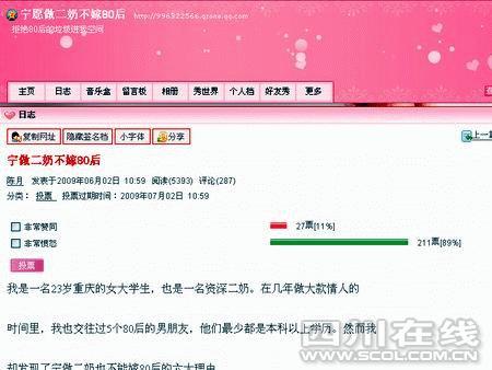 該QQ空間名為“寧愿做二奶不嫁80后”,一共只有兩篇日志:《本人真實個人資料》和《寧做二奶不嫁80后》,先后發(fā)表于6月2日10:55和10:59,前后相差4分鐘。相冊里僅有一張照片,即網(wǎng)帖里公布的那一張“本人真實照片”。