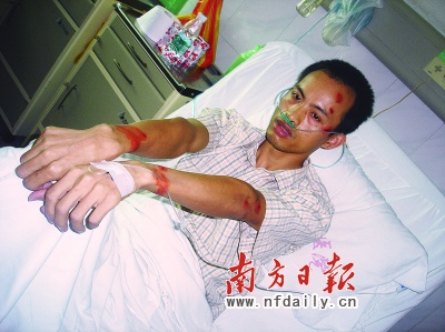 昨日下午,記者趕到三水區人民醫院住院部,傷者韋奕慶正躺在病床上打吊針,他鼻子里插著氧氣管,左額、太陽穴、眼角及下巴等多處涂著紫藥水。