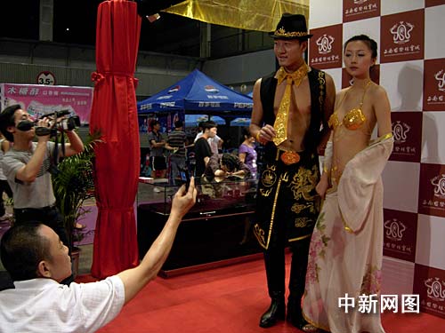 中新網(wǎng)重慶6月27日電 (姜誠(chéng)意) 27日,在此間舉辦的重慶婚博會(huì)上,一名醉意熏熏的男子借著酒意,在內(nèi)衣女模面前大膽越界拍照,甚至企圖手摸女模展示的天價(jià)黃金內(nèi)衣,嚇得模特花容失色并停止了展示。