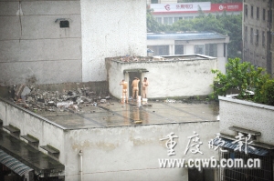昨日下午5點30分,大渡口區文體路順祥壹街區A2棟16樓,28歲的劉莉正在自家廚房做飯。她不經意地往窗外一望,只見約兩百米開外的一棟破舊樓房頂上,幾條白花花的身體映入眼簾——幾個成年男子脫掉衣褲,腳邊放著水桶,竟然又在屋頂洗澡!