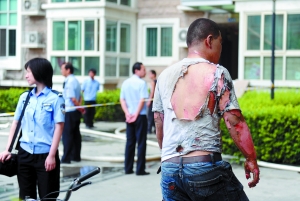約十多分鐘后,男子跟著小姜走出地下室。此時,男子渾身漆黑,手臂、背部等被燒傷,衣服破了一個大洞。