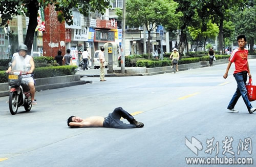 事發昨日正午,記者在漢陽郭茨口看到,一名男子上身裸露,手提一袋醫院的病歷資料,情緒激動地躺在馬路中央,脊背被路面燙得通紅。此時路面車流不息,該男子處境十分危險。“快把他拉回來!”幾名路人見狀后,靠近該男子,欲將其拉到路邊,但該男子并不領情,堅決不起身。幾分鐘后,二橋派出所的民警趕來,要求該男子去派出所再說,該男子置之不理。民警表示,早8時許和10時許,該男子曾在附近路面躺過兩次,都被他們帶回了派出所,他們這已是第三次為該男子出警。“有什么委屈就說出來,那樣心里痛快點。”見民警束手無策,熱心路人們開始輪番上前勸解。眾路人汗流浹背,頂著烈日站在馬路中央,對該男子動之以情、曉之以理。半小時后,該男子陸續說出了心中的不快。又經勸解,該男子終于答應跟民警回派出所,將事情說清楚。