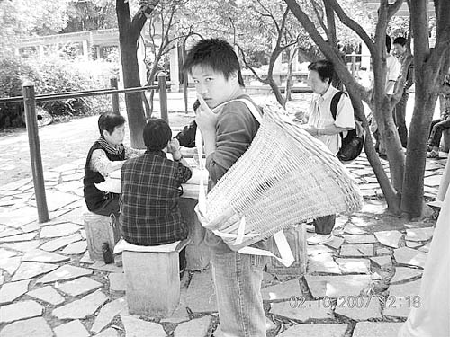 他的背篼,有自己身高的一半那么長,每次放上五六十斤重的大米、糧油,走上差不多兩里地,頂多能賺5元錢。每天,這個大學畢業生和貴陽街頭的其他“背篼”們一起,躲在瑞金北路能避雨遮陽的沿街屋檐下,或者在華聯、沃爾瑪一類的地方蹲點,平均一天掙不到20元。