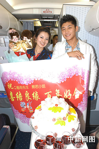 東航江蘇公司客艙部獲悉這一信息后,乘務(wù)長潘忠威花費了一天的時間購買鮮花、香檳酒、布娃娃玩具、云錦禮品等,并且還特意設(shè)計制作了祝賀圖版,上面寫有“喜結(jié)良緣,百年好合”。