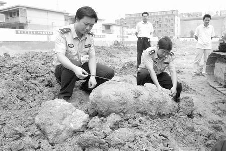 許昌市公安局和魏都公安分局民警聞?dòng)嵹s來,根據(jù)外形判斷這是一枚抗日戰(zhàn)爭時(shí)期遺留下來的航空炸彈,尾翼已被腐蝕掉。經(jīng)測量,腐蝕后的彈身長1.5米,直徑50厘米,重量300多公斤(如圖)。隨后,該枚炸彈被民警妥善處置。