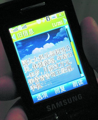 “闊太太俱樂部招男公關,體健貌端,年齡18歲至45歲,月薪過萬元。詳情請咨詢王經理,手機13×××××××××。”2008年4月20日,徐州市民張群(化名)突然收到一條招聘短信。“月收入過萬元啊,有這么好的事情。”張群急忙回電話進行咨詢。一位自稱李經理的人接了電話,一番詢問后,李經理對張的條件很滿意,并約定在徐州開源名都大酒店(五星級)進行面試。“你到了以后就到大廳打我電話,我們會派人對你進行考察。”李經理說。