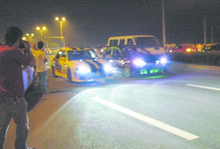 昨日上午,就有市民打進本報熱線稱,晚上10時,有人組織了18個車友會在成龍路九芝堂藥業下個口子的右邊舉行一場大型飆車活動。不過這名報料者隨后又打進電話稱活動取消了。昨晚9時40分,記者還是決定趕到現場一探究竟,采訪車才行駛至川師南大門時,就不停有改裝車從旁邊呼嘯而過。行駛過九芝堂藥業,路邊果然停了一長串私家車。從成龍路右拐進入就是經開區的南北干道,兩旁也停滿了各種各樣的私家車,包括206、雨燕、?怂埂W迪、奔馳等。這些車按車型停放,很多車的外觀進行了噴繪,還有很多車甚至加了渦輪增壓。一些車主下車聊天,一旁穿著時尚的辣妹十分惹眼。而附近一些居民見此陣仗,舉家老小也出來看熱鬧。幾百輛車很多都開著車燈,不時有改裝車呼嘯而過,路人的目光也隨之遠去。