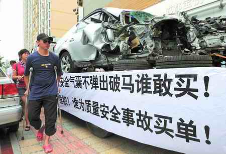 昨日上午,很多途經市中心的市民都目睹了一支稀奇的隊伍:尼桑開道,拖車尾隨。拖車上躺著一輛銀色寶馬,車頭右側受損嚴重,右前車門扭曲,兩個前胎都脫離車體。拖車的三面拉著白底黑字的橫幅,上書“寶馬自然爆胎安全氣囊不彈出 破馬誰敢買!誰為消費者維權!誰為質量安全事故買單!”等字樣。
