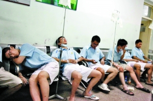 昨日凌晨,北醫(yī)三院急診大廳內(nèi)擠滿了身穿“北京郵電大學(xué)”服裝的輸液學(xué)生。