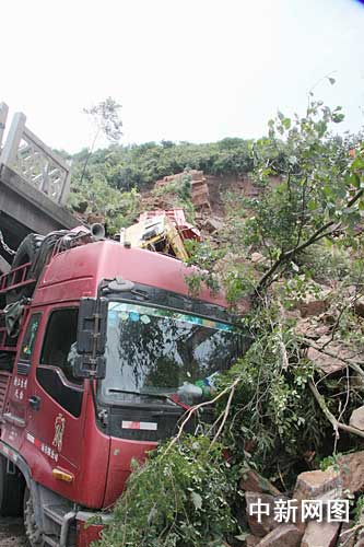 中新社紹興八月十五日電 ( 江耘 余昌龍 倪春軍)八月十五日上午九時(shí)許,一0四國(guó)道浙江嵊州三界鎮(zhèn)清風(fēng)橋路段發(fā)生山體塌方,一萬(wàn)多立方山石襲向一0四國(guó)道和清風(fēng)大橋,造成道路中斷,正在行駛的車子被埋山石中。不幸中的萬(wàn)幸,車內(nèi)的五名遇險(xiǎn)人員死里逃生。